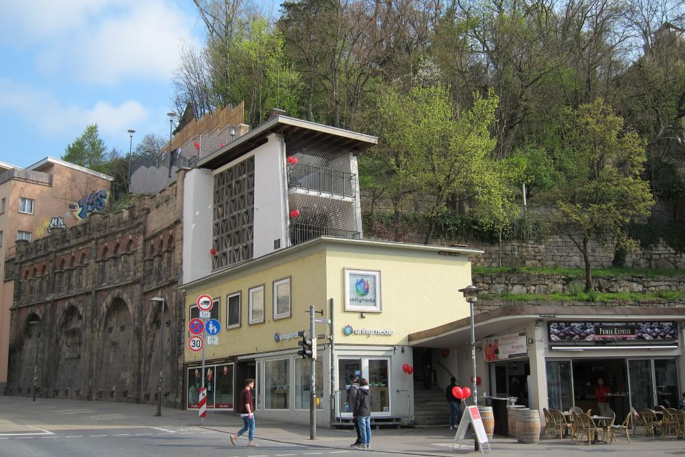Denn als man den an der Neckarseite unscheinbaren Eingang am Germaneneck (beim Primer Express) markieren wollte, konnte man sich nicht auf eine Bezeichnung einigen. So gibt es eben keine, nur einen Wegweiser davor, der zum Österberg zeigt. Ich vermute, die Benutzung ist ohnehin so gering (mit E-Bikes hat auch der Österberg seinen Schrecken für Radfahrer verloren und für Touristen ist er kaum noch interessant), dass es auch keine große Rolle spielt. Die Kosten waren immerhin stolze 900.000 und es gab Behinderungen in einer sehr langen Bauzeit.